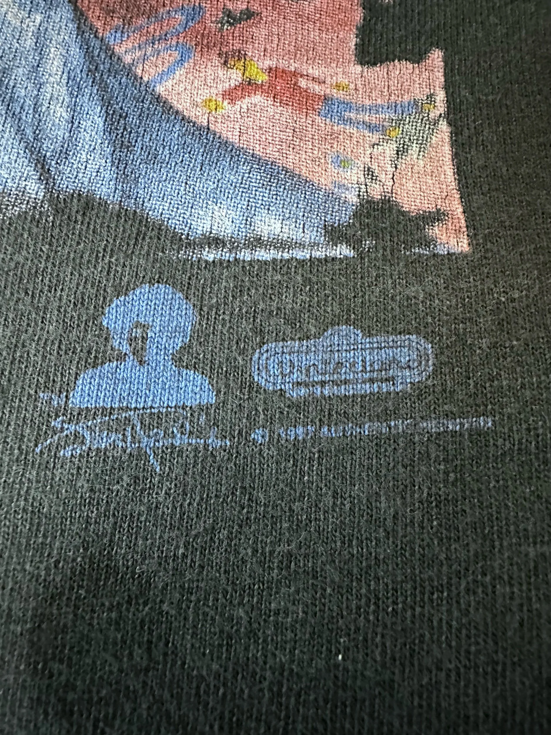This unofficial Rush “Test for Echo” t-shirt, likely sold in the parking lots outside venues during the band’s 1996–1997 tour, is a genuine product of fan culture from a fading era of rock merchandising. Featuring a slightly bootlegged rendition of the “Test for Echo” album artwork with the iconic Rush logo emblazoned above it, the shirt captures the raw energy and authenticity of the unofficial side of touring—an era when band devotees would sling tees out of trunks or under folding tables, giving fans a cheaper and sometimes cooler alternative to the merch booth inside.