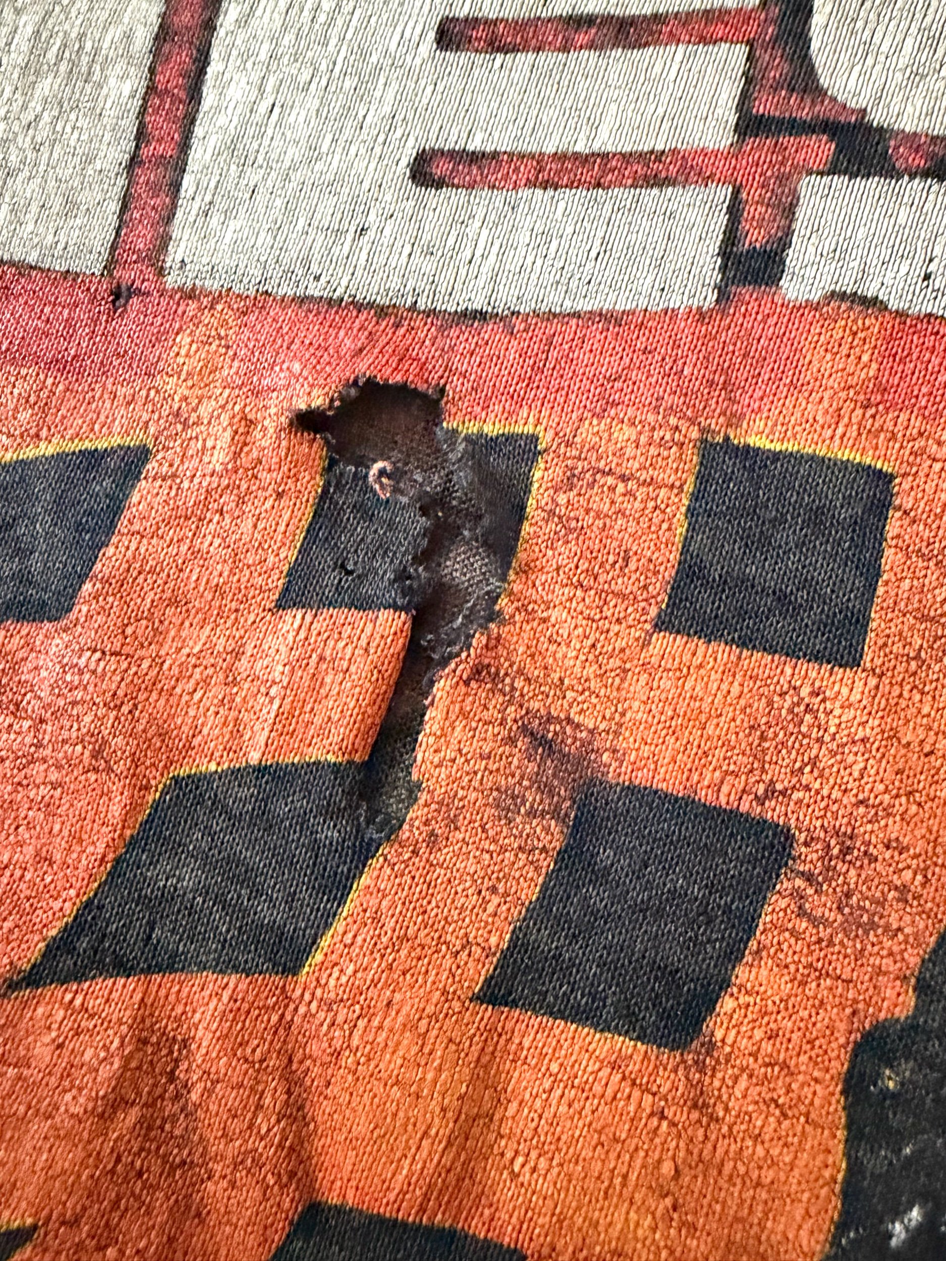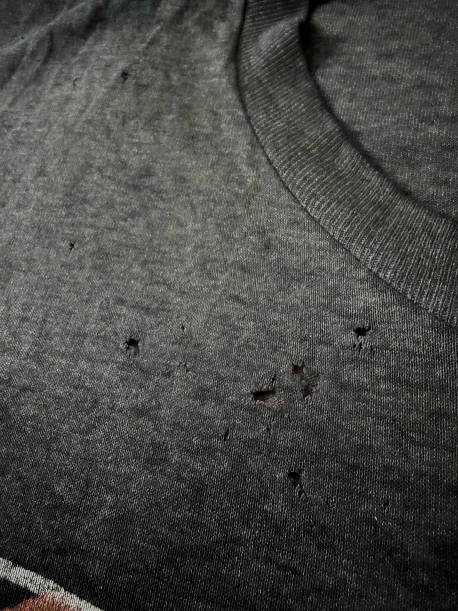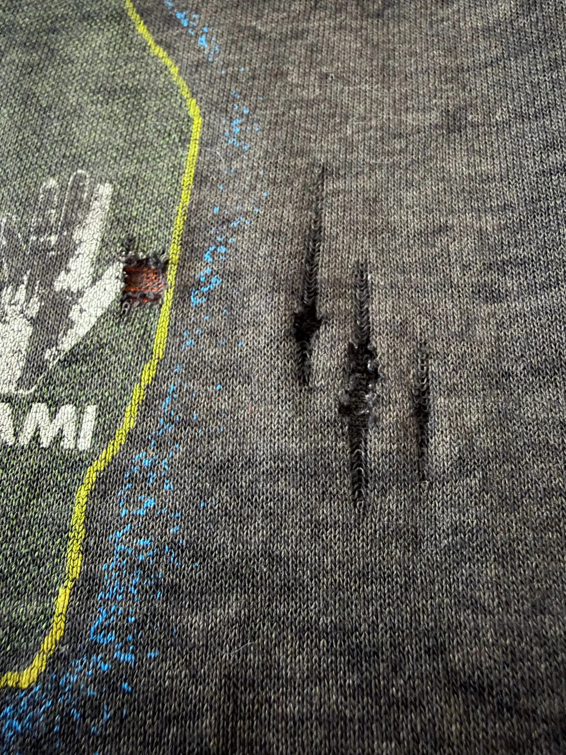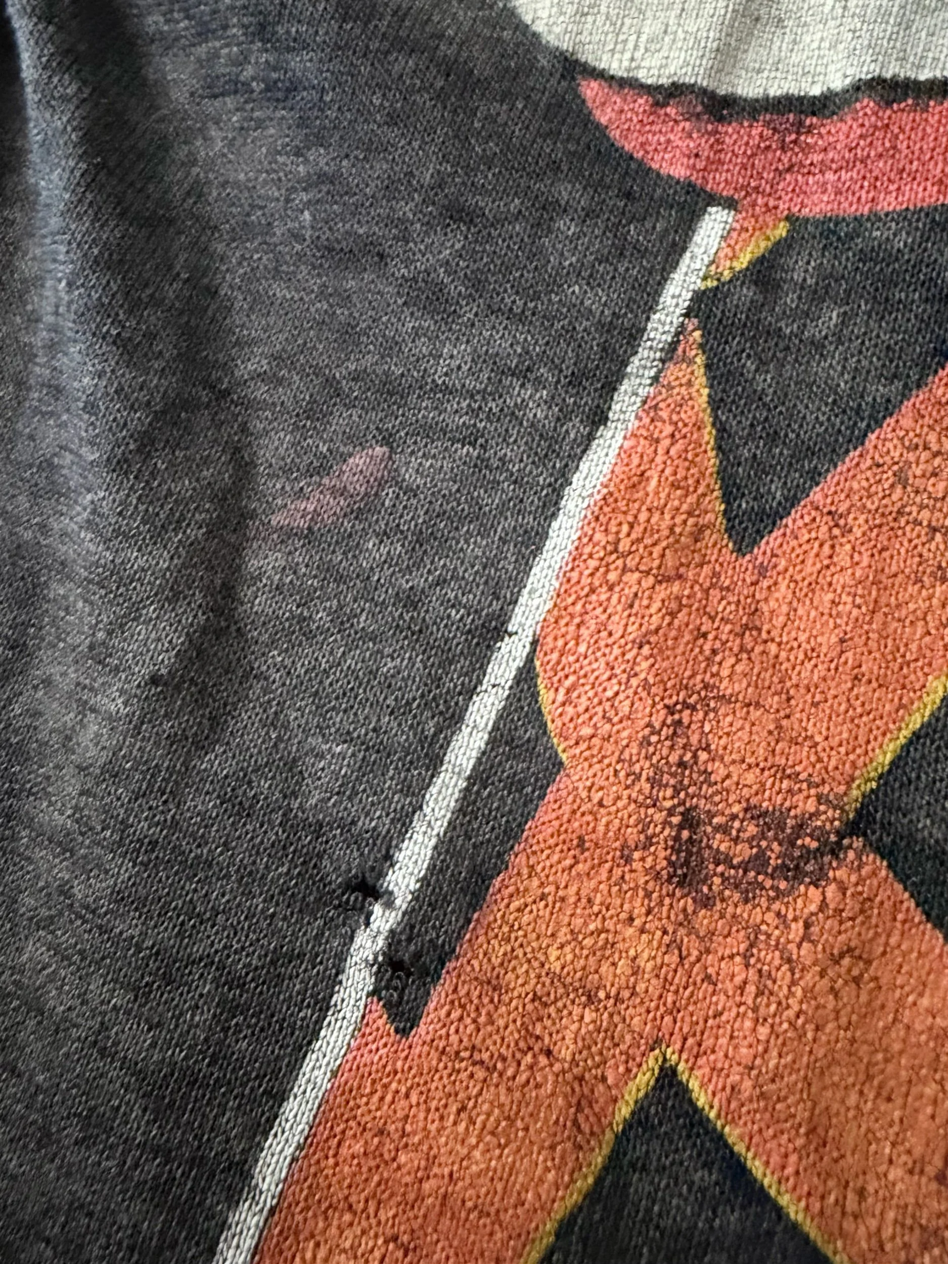 This garment is in good vintage condition, possessing a natural and even charcoal fade throughout the body. The fabric is extremely soft to the touch, providing a comfortable broken-in feel that modern reproductions cannot mimic. While there is a consistent fade to the graphics on both sides, the visual integrity of the artwork remains intact with no major structural damage or significant holes observed. The construction remains solid across all seams, with the sizing reflecting the slightly boxy proportions of a late-80s American Large.
